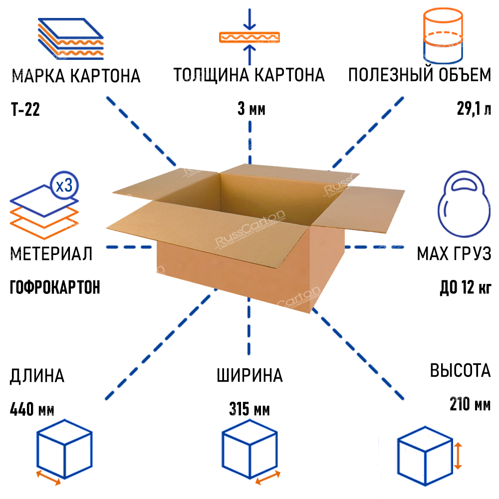 Картонная коробка размером 440х315х210 мм — универсальное решение для хранения и транспортировки товаров. Этот надёжный помощник выполнен из бурого картона плотностью Т-22, который обеспечивает защиту содержимого от повреждений во время перевозки.