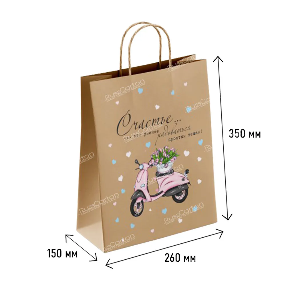 Крафт-пакет идеально подходит для упаковки подарков, сувениров, одежды и других товаров. Удобные крученые ручки рассчитаны на среднюю нагрузку, что делает его практичным для покупок. Размер 35х26х15 см позволяет разместить внутри как компактные, так и более объемные предметы. Изготовленный из прочного и экологически чистого материала, пакет гарантирует надежность использования. Стильный дизайн с надписью «Счастье есть» придаёт упаковке особую эстетичность. Этот пакет отлично подходит для розничной торговли, мероприятий и магазинов подарков — идеальный вариант для бизнеса, который ценит стиль и функциональность.